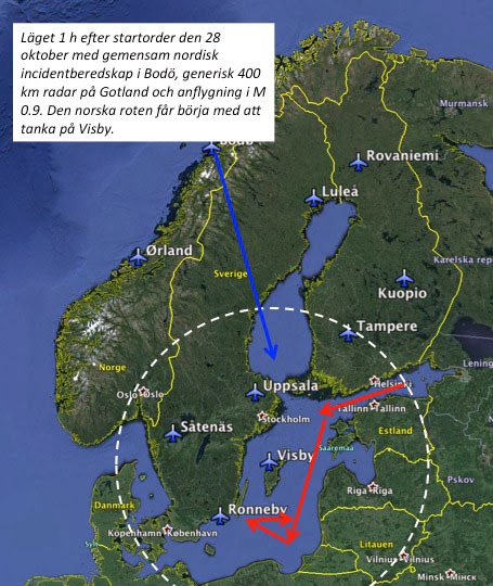 För den svenska incidentroten hade det då tagit drygt 40 minuter att flyga distansen till Tallinn i Finska Vikens inlopp. Att döma av flygbanorna från inslaget i SVT Rapport tog de ryska flygplanen vägen ner längs den baltiska kusten innan anfallslöporna påbörjades. Eftersom de ryska flygplanen redan är i rörelse när larmet går till den svenska incidentberedskapen blir mötespunkten inte i Finska Viken utan istället nere längs den baltiska kusten, gissningsvis i höjd med Rigabukten. En incidentrote baserad i Luleå hade aldrig hunnit fram förrän övningen var över och då dessutom med en sådan bränslenivå att man hade varit tvungen att avbryta mycket snabbt för tankning (se längre ner i inlägget för avståndsuppgifter från olika nordiska baser).